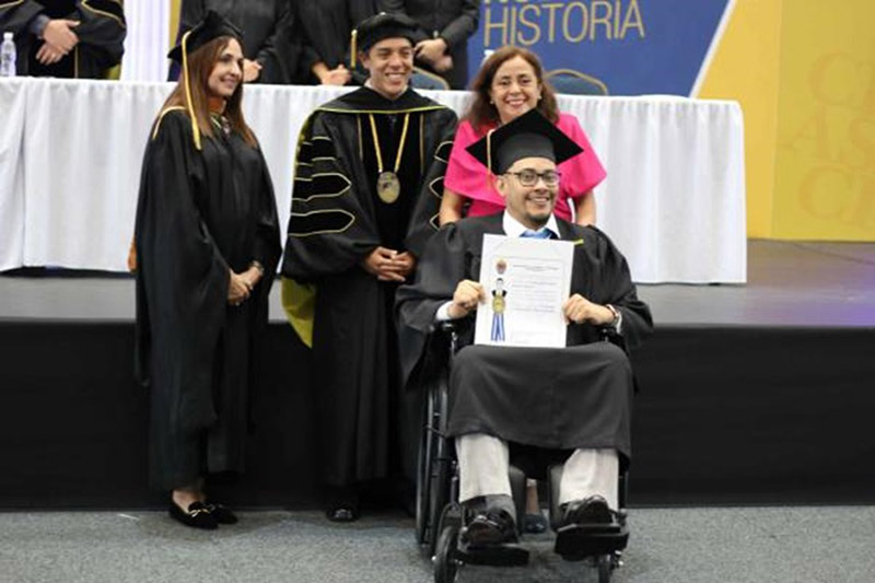 También, fue emotivo y de sonoros aplausos el momento en que se llamó a recibir su título universitario el joven Cristian Osorto, con discapacidad motora, pero que no fue limitante para cumplir una de sus metas de su vida al obtener el título que lo acredita como Licenciado en Informática Administrativa.