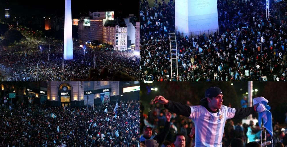 Al grito de «Dale campeón!» los fanáticos, muchos envueltos en banderas argentinas desataron la fiesta pese a las bajas temperaturas del invierno austral, en los alrededores del emblema porteño, epicentro de los festejos en Buenos Aires.