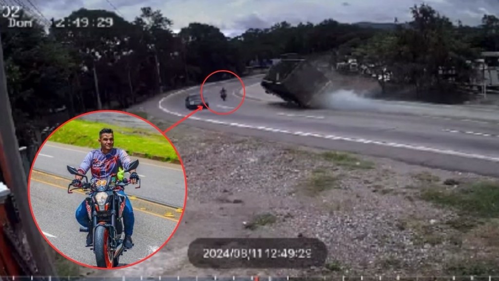 En las imágenes, captadas por una cámara de seguridad cercana a la escena del accidente, se observa cómo un camión perdió el control y volcó en plena carretera. Justo en ese momento, el joven identificado comoCarlos Zavala venía en dirección contraria y fue impactado con el contenedor que iba cargado de ladrillos.