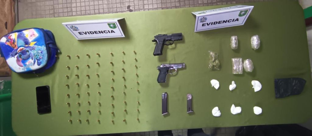 Durante el operativo, se le decomisaron dos pistolas calibre 9mm, 60 cartuchos sin percutir, cinco envoltorios con supuesta marihuana, seis envoltorios con supuesta cocaína y un celular.