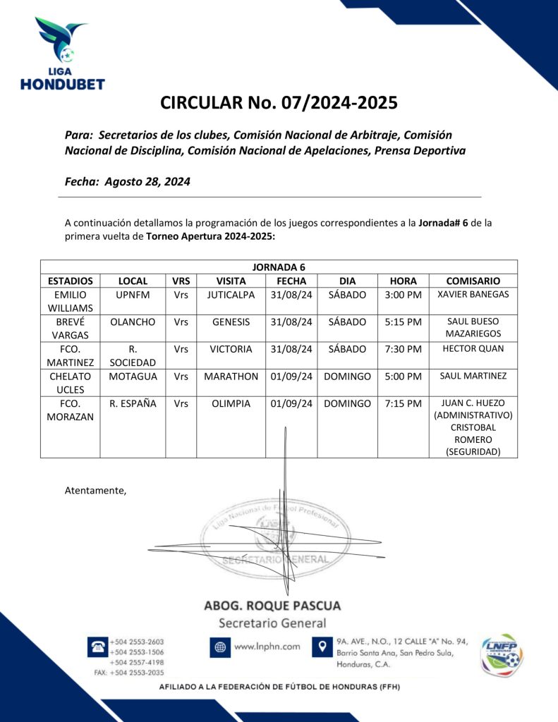 La Liga Nacional por medio de una circular ha hecho oficial la programación de la jornada seis del torneo Apertura, que tendrá como atractivo los cruces entre los equipos de Tegucigalpa y San Pedro Sula.