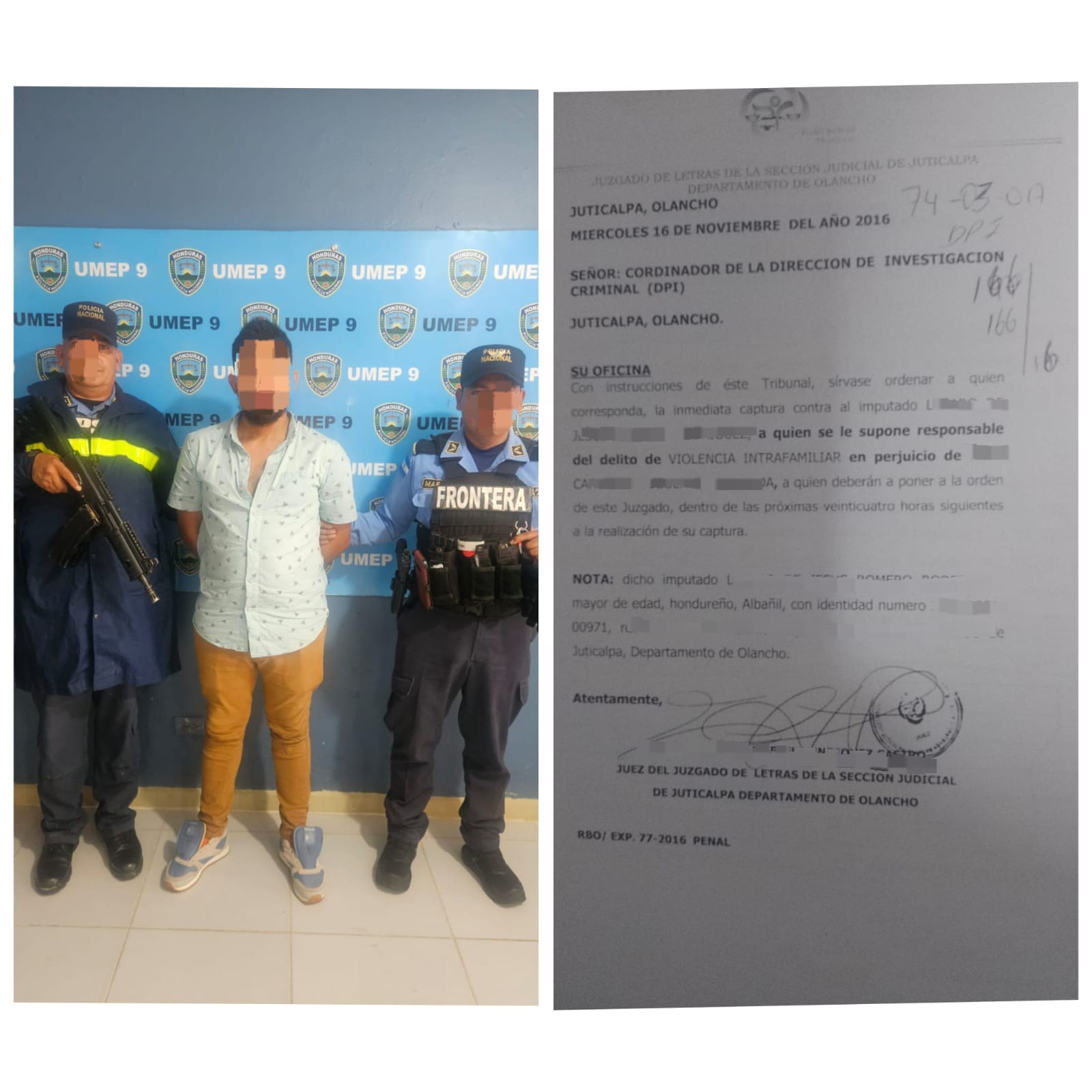 El detenido, originario de Juticalpa, Olancho, y residente en Mejía Villatoro, Olancho, se encontraba bajo una orden de captura emitida por el Juzgado de Letras de la Sección Judicial de Juticalpa desde el 16 de noviembre de 2016.