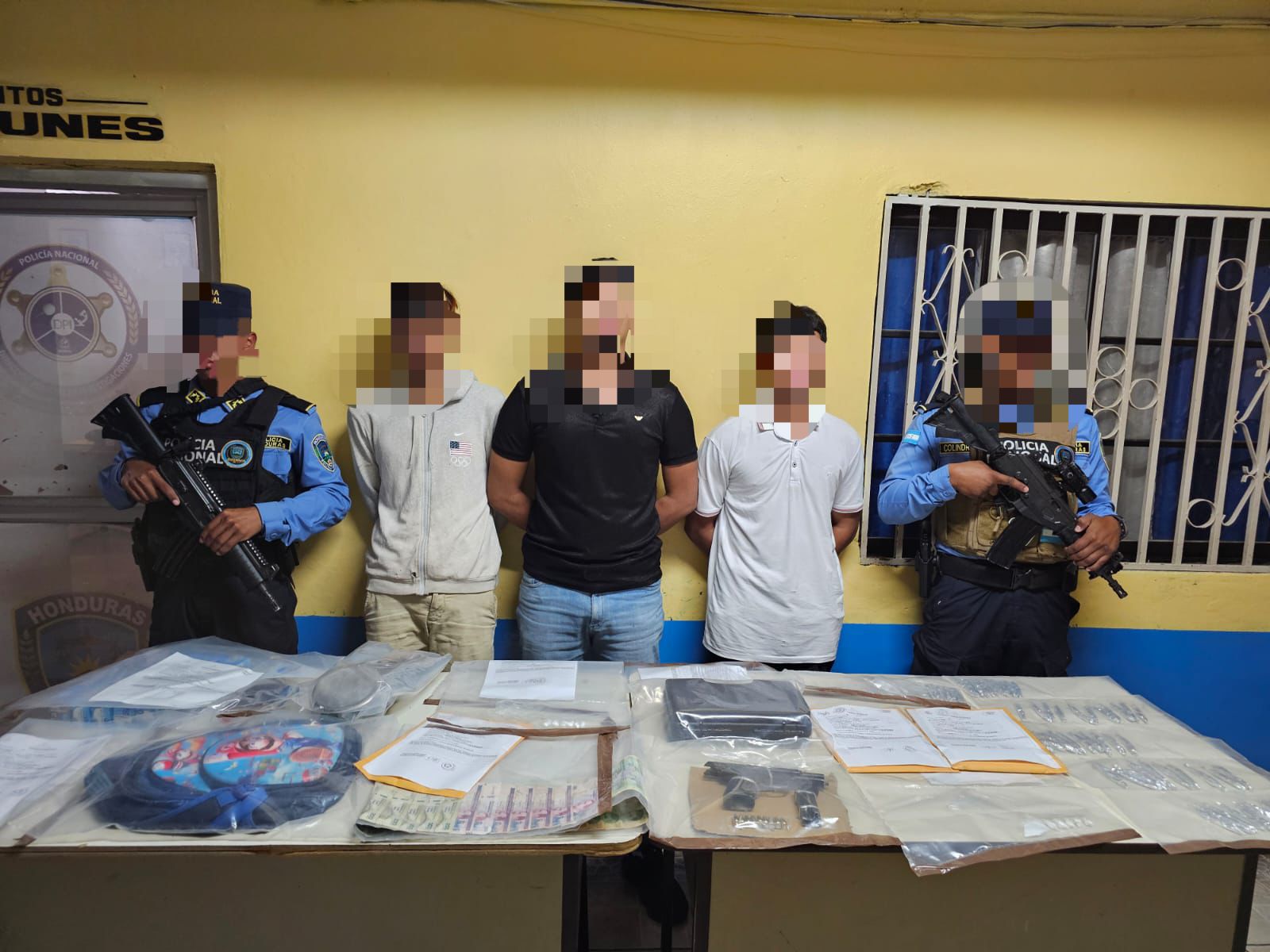 Al primero de los detenidos se le incautaron 56 envoltorios con polvo blanco supuesta cocaína, 6 mil lempiras en efectivo, un microbús, una pistola con su cargador y varios cartuchos sin percutir.