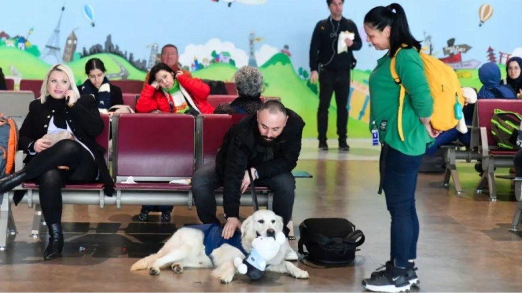 Cuando entra en la terminal del aeropuerto de Skopje, Dino, de 4 años, conquista a todos. Con su pelaje dorado y su pequeño chaleco azul, este Golden Retriever ofrece un momento de relajación a los pasajeros que están a punto de embarcar en Macedonia del Norte.