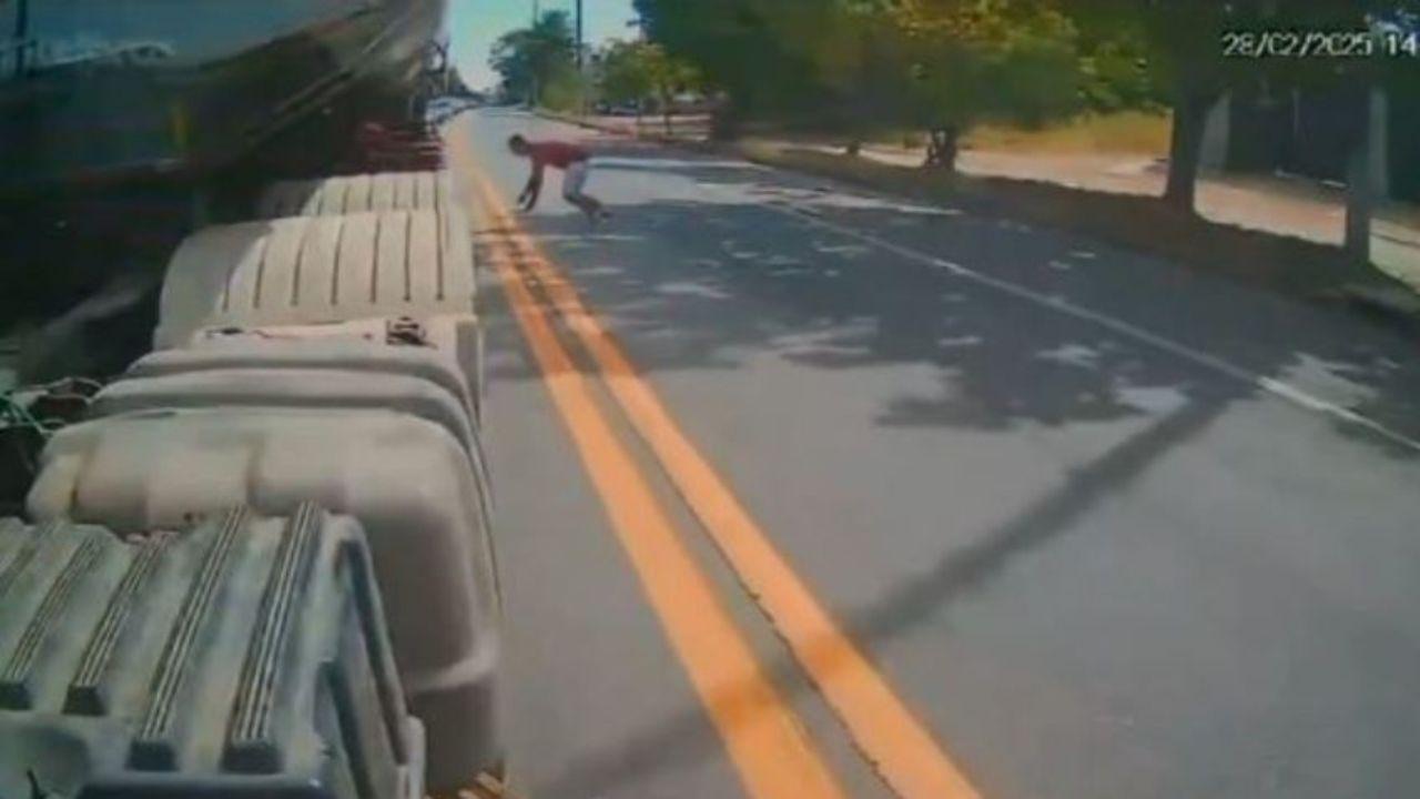 En las imágenes se ve al Hombre caminando junto a la carretera, sin llamar la atención. Sin embargo, en el instante en que el tráiler comienza a ganar velocidad, el sujeto toma impulso y se lanza bajo las llantas.