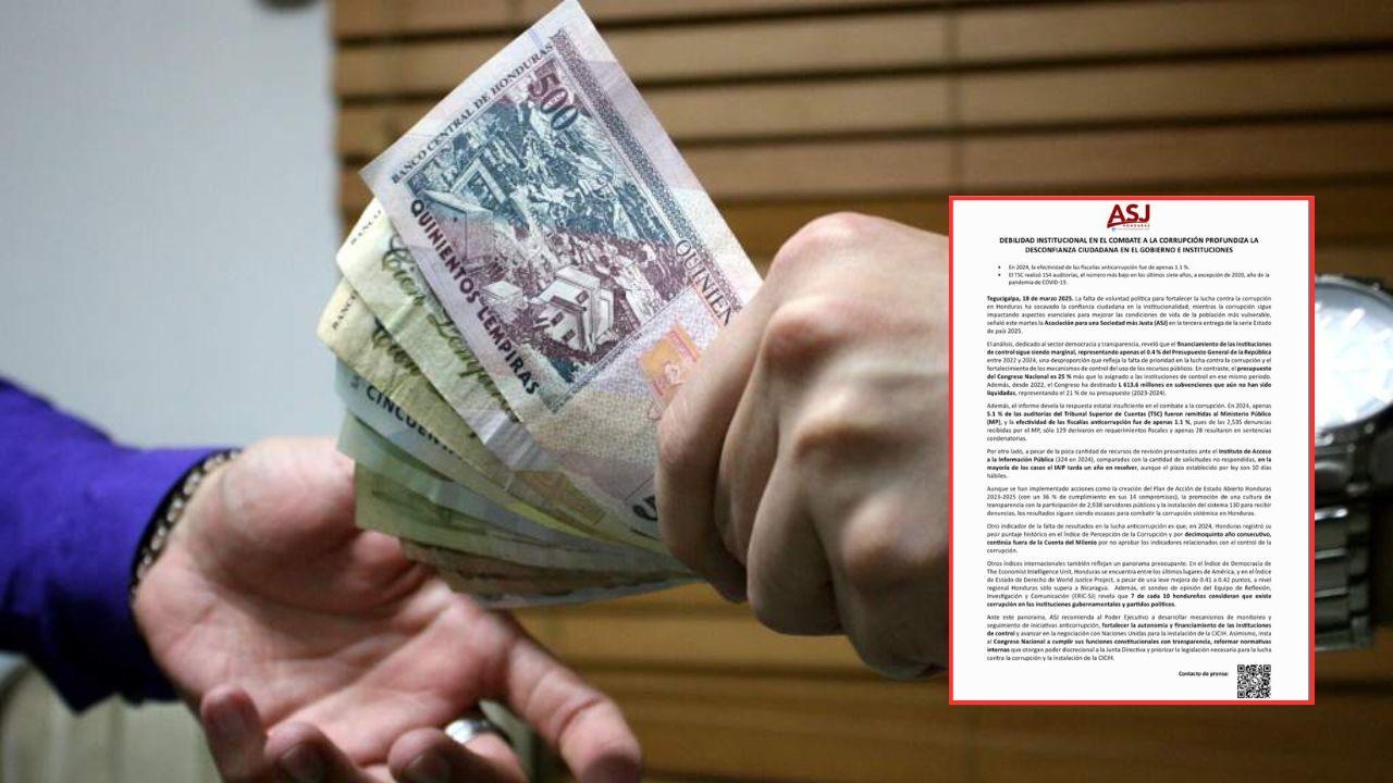 Este panorama, la ASJ instó al gobierno a fortalecer los mecanismos de control, garantizar mayor financiamiento a las instituciones de transparencia y priorizar la instalación de la Comisión Internacional contra la Corrupción e Impunidad en Honduras