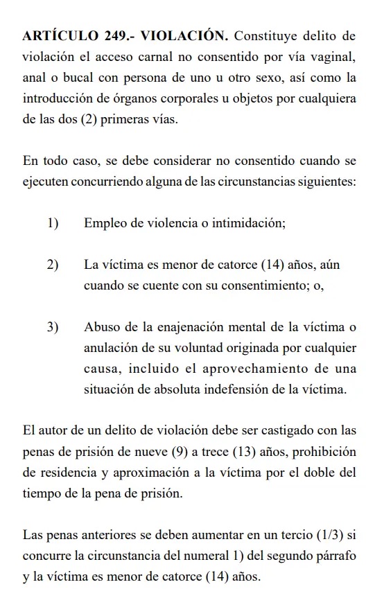 El Código Penal de Honduras, en el artículo 259 establece que. El autor de un delito de violacíon debe ser castigado con las penas de prisión de nueve 9 a trece 13 años, prohibición de residencia y aproximación a la víctima por el doble del tiempo de la pena de prisión.