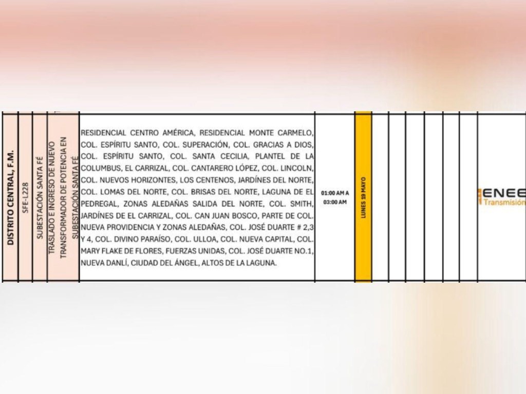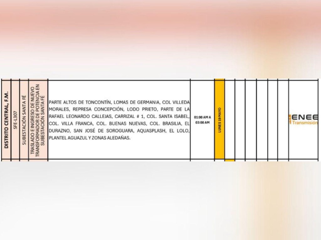 La Enee informó que instalarán un nuevo transformador de potencia en una subestación eléctrica. Una amplia lista de barrios y colonias estarán sin luz por más de dos horas.