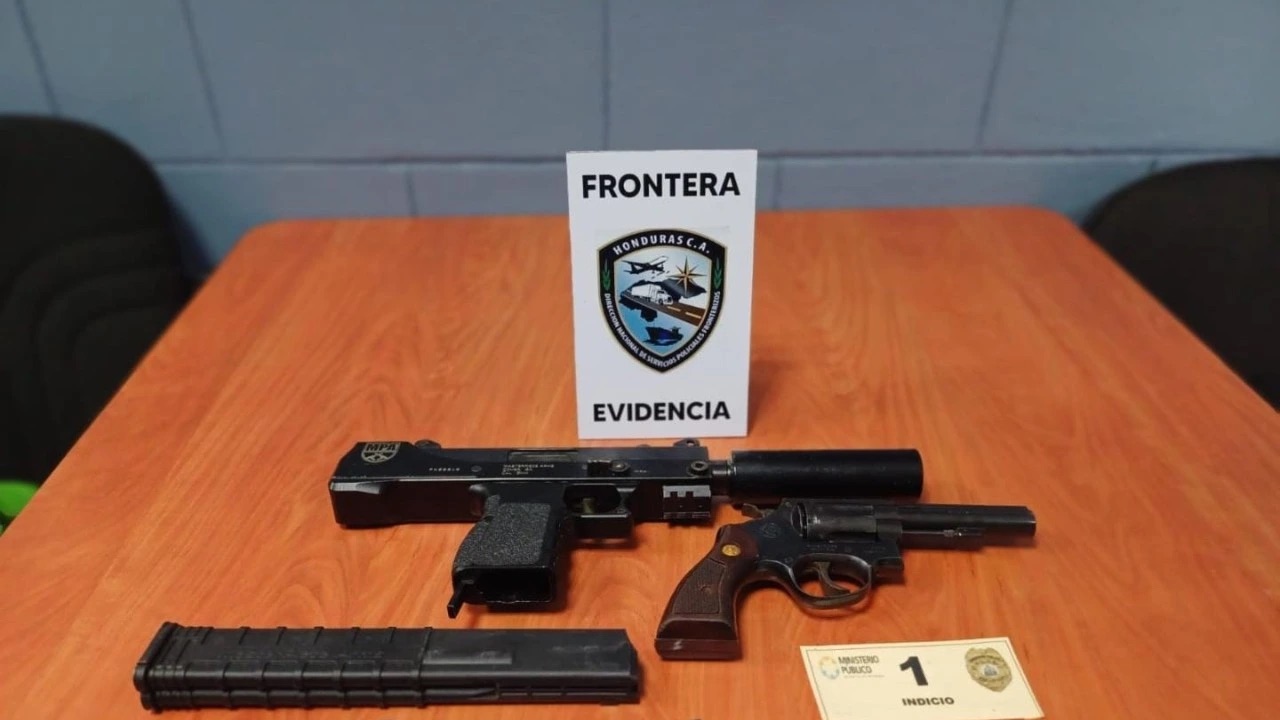 Luego la inspección, la Policía Nacional indicó que entre los decomisos está, una pistola marca Master Piece Arms Comer,GA, calibre 9 mililitros mm, un revólver calibre 38, un cargador color negro para pistola 9 mm y un silenciador metálico en color negro.