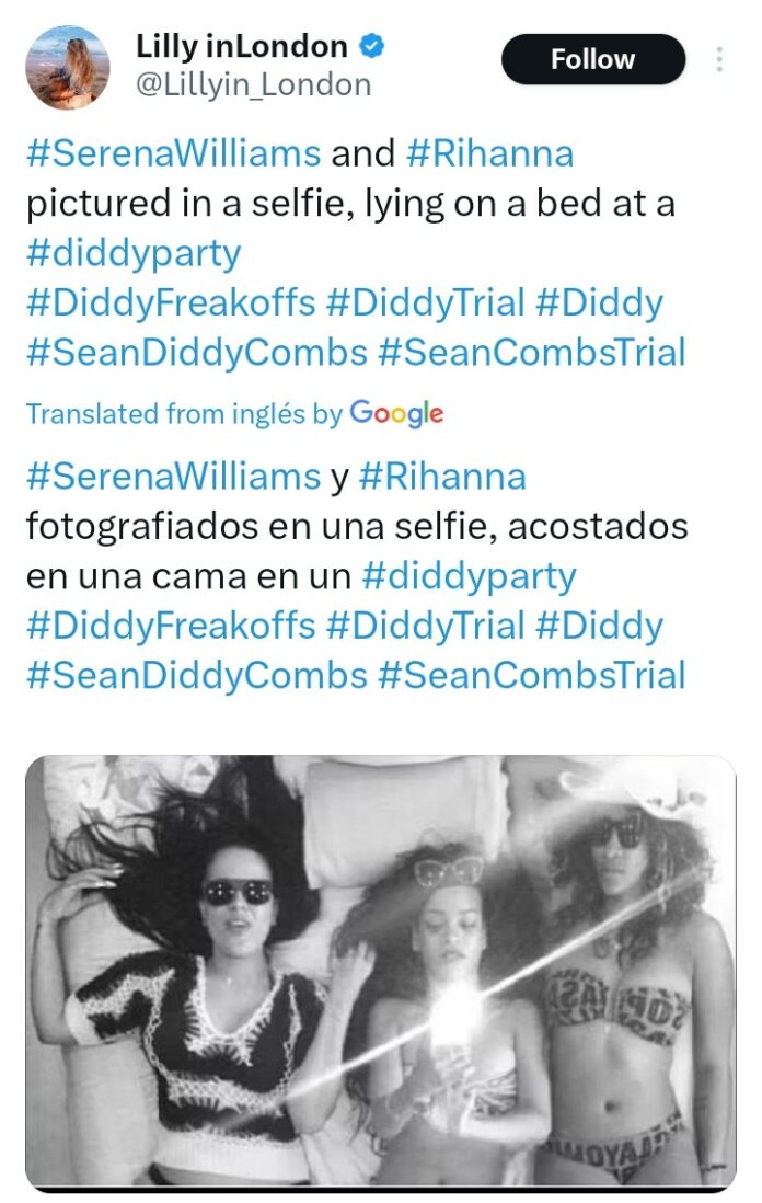 La fotografía, presentada como evidencia ante el tribunal y obtenida por el Daily Mail, muestra a dos de las mujeres más reconocidas del mundo del espectáculo y el deporte: la cantante Rihanna y la tenista Serena Williams, ambas recostadas en una cama en bikini bajo un techo cubierto de espejos deteriorados.