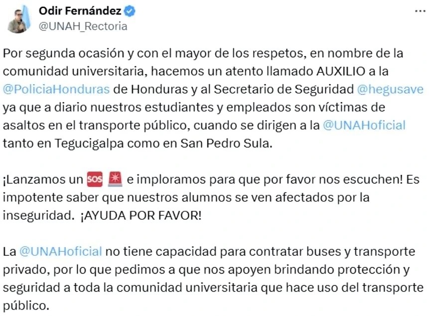 «Lanzamos un SOS e imploramos para que por favor nos escuchen! Es impotente saber que nuestros alumnos se ven afectados por la inseguridad. ¡Ayuda, por favor!», escribió el rector de la UNAH en su cuenta de X.