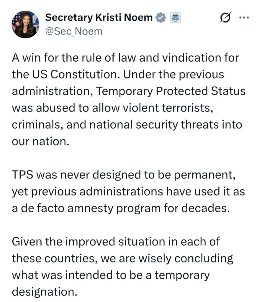 En un mensaje publicado en la red social X, Noem fue enfática al afirmar que, bajo administraciones anteriores, el TPS “se abusó para permitir la entrada a terroristas violentos, criminales y amenazas a la seguridad nacional”, y que el programa “nunca fue diseñado para ser permanente”.
