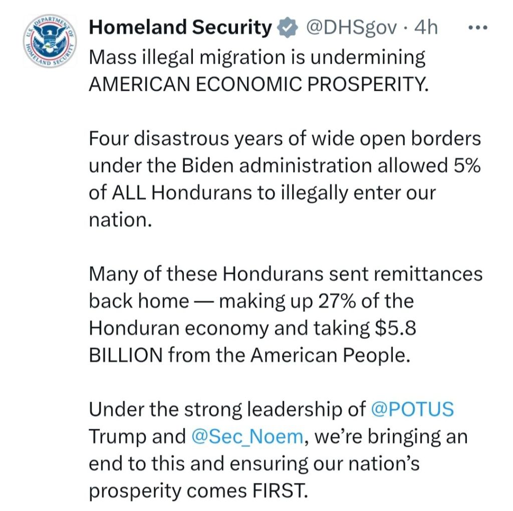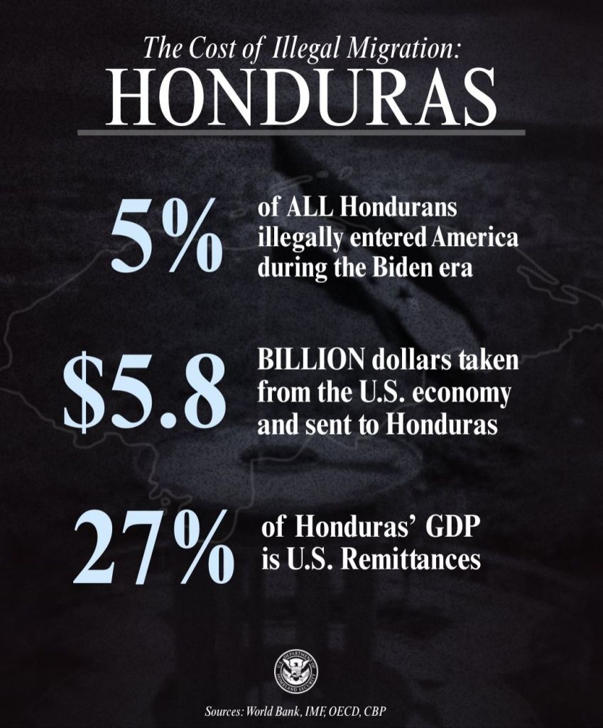 Según la publicación, aproximadamente el 5 % de los hondureños habría ingresado ilegalmente a territorio estadounidense en ese período. Asimismo, el comunicado sostiene que muchos migrantes enviaron remesas hacia Honduras, las cuales representarían el 27 % de la economía nacional y, de acuerdo con el argumento expuesto, implicarían una salida de 5.8 mil millones de dólares de la economía estadounidense.
